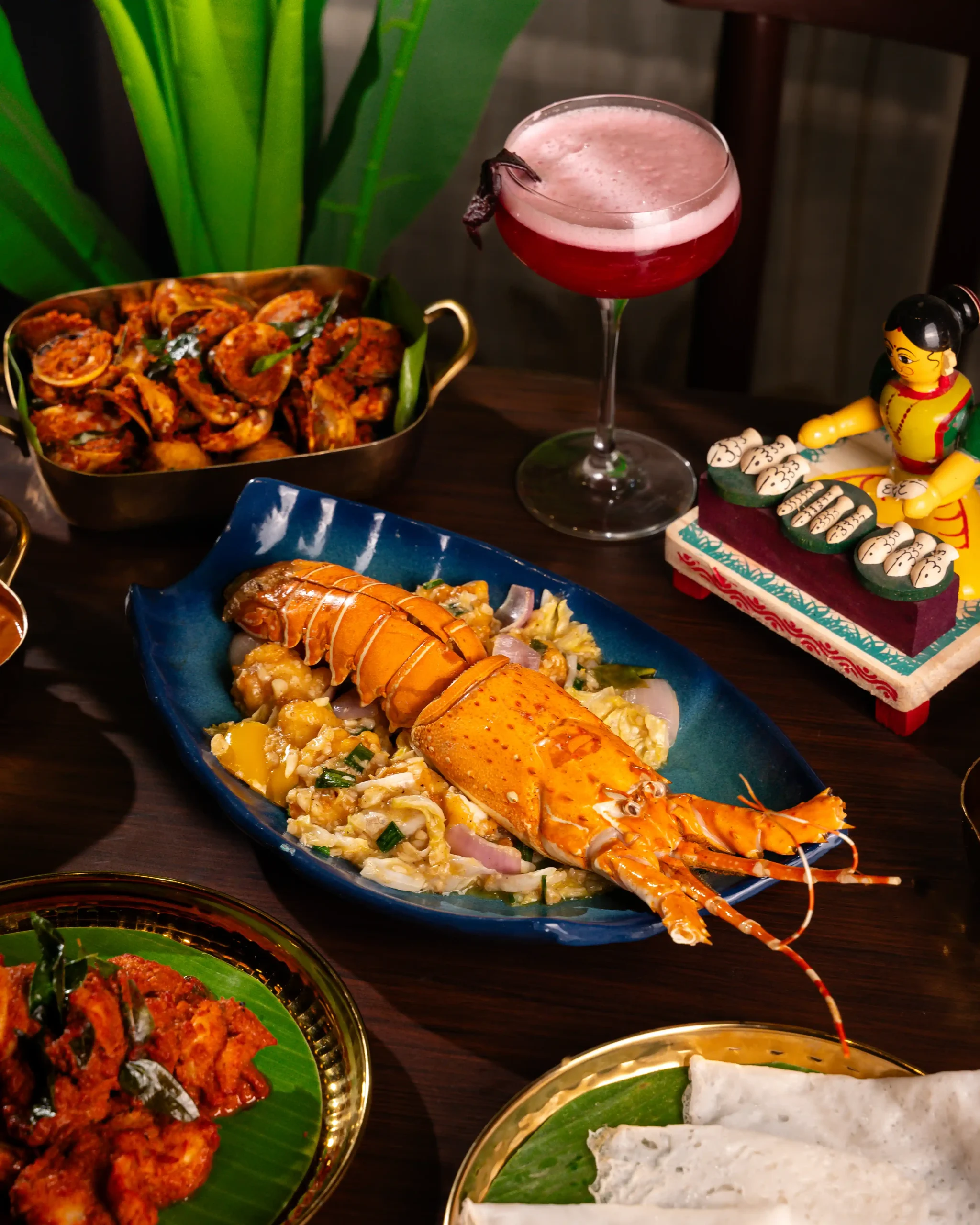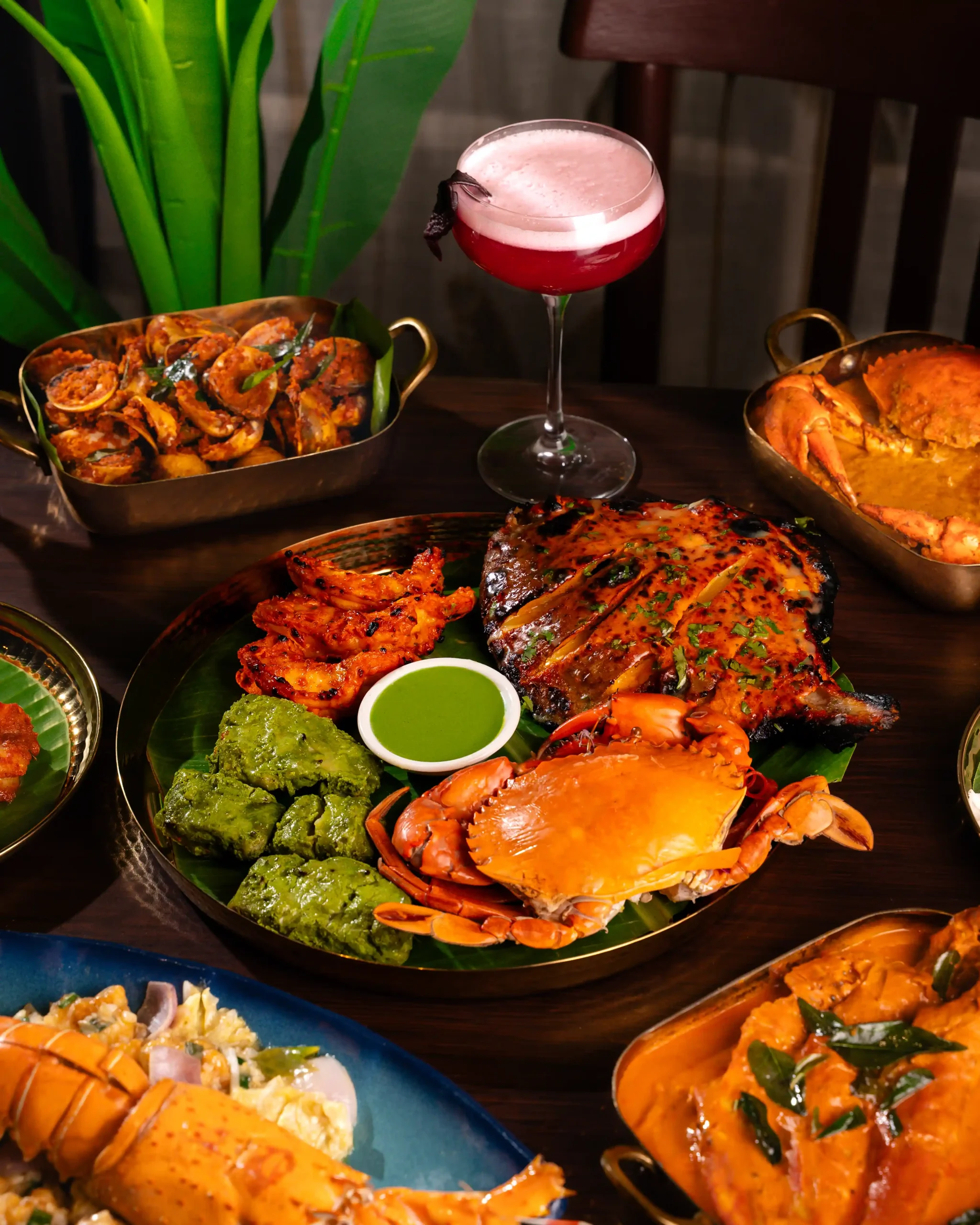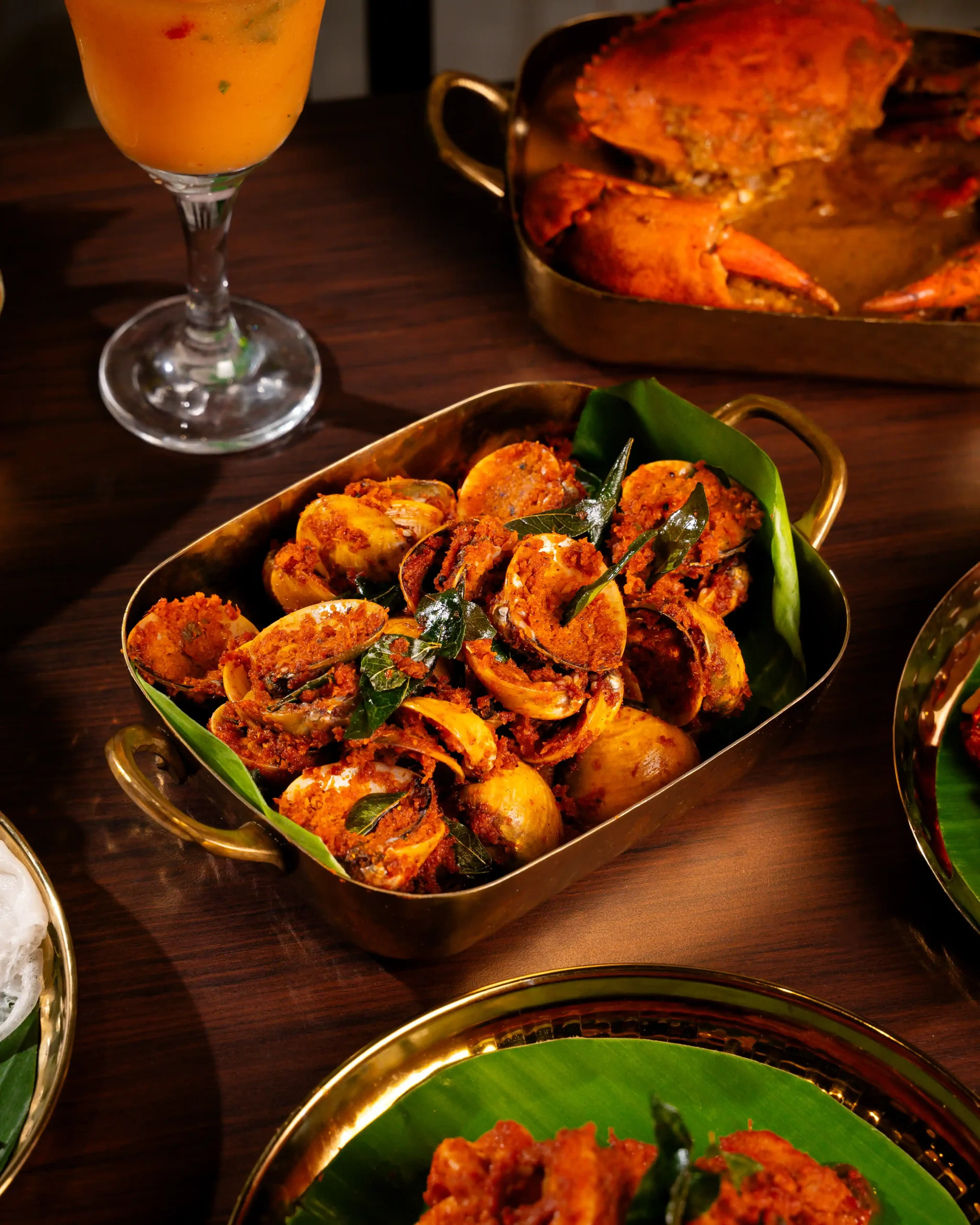 The culinary programme is led by Chef Nagesh, whose approach to coastal cuisine is grounded in patience, memory, and deep respect for tradition. Each curry, masala, and seafood preparation follows ancestral techniques, allowing flavours to develop naturally and authentically. The menu features a carefully curated selection of signature dishes that showcase the diversity of coastal cooking, including the fiery Crab Chettinad, the aromatic Pomfret Gassi with freshly ground coconut masala, the bold Prawns Ghee Roast, the spice-forward Surmai Masala Fry, and the intensely flavourful Clams Sukka, where roasted spices and fresh coconut come together in perfect balance.