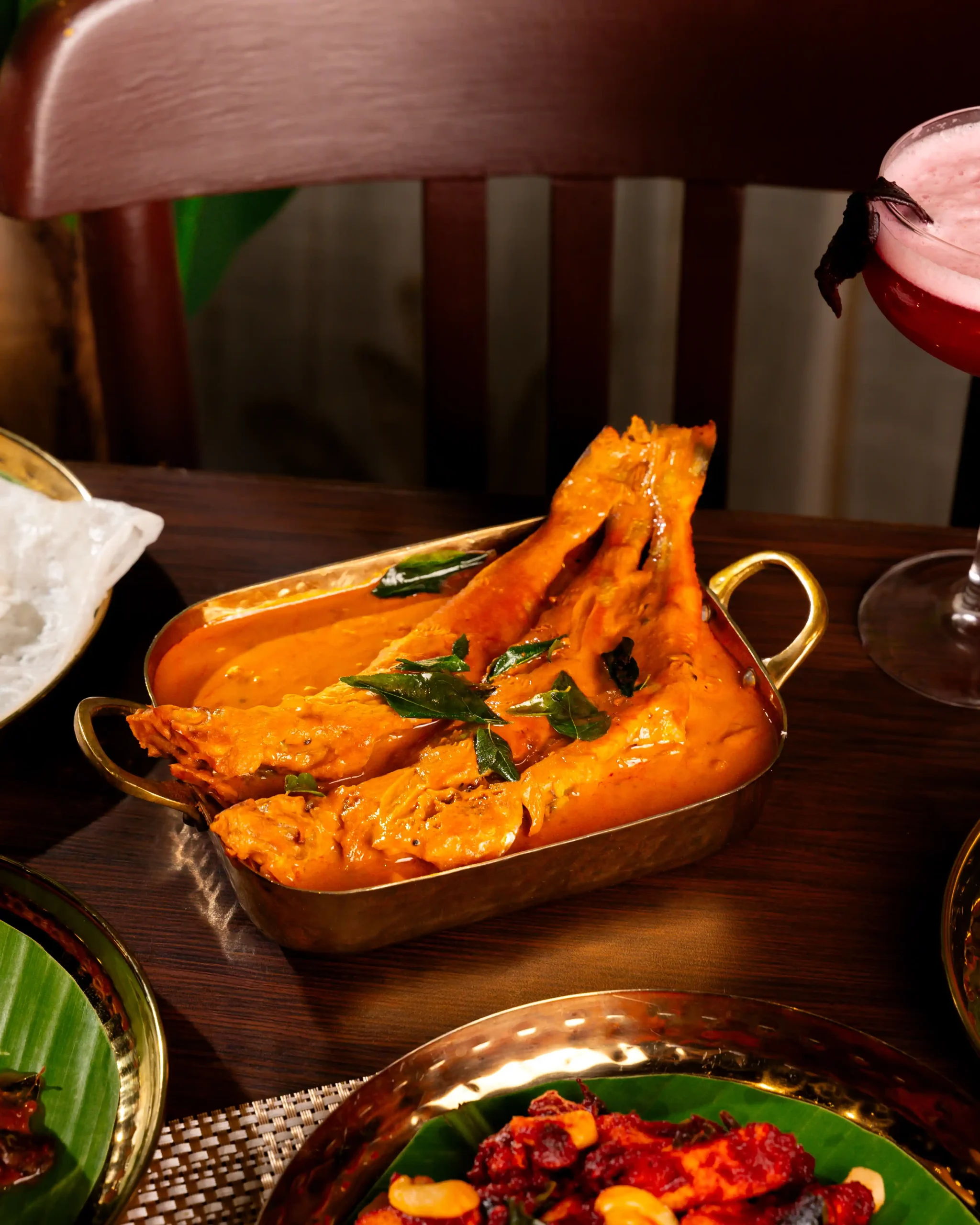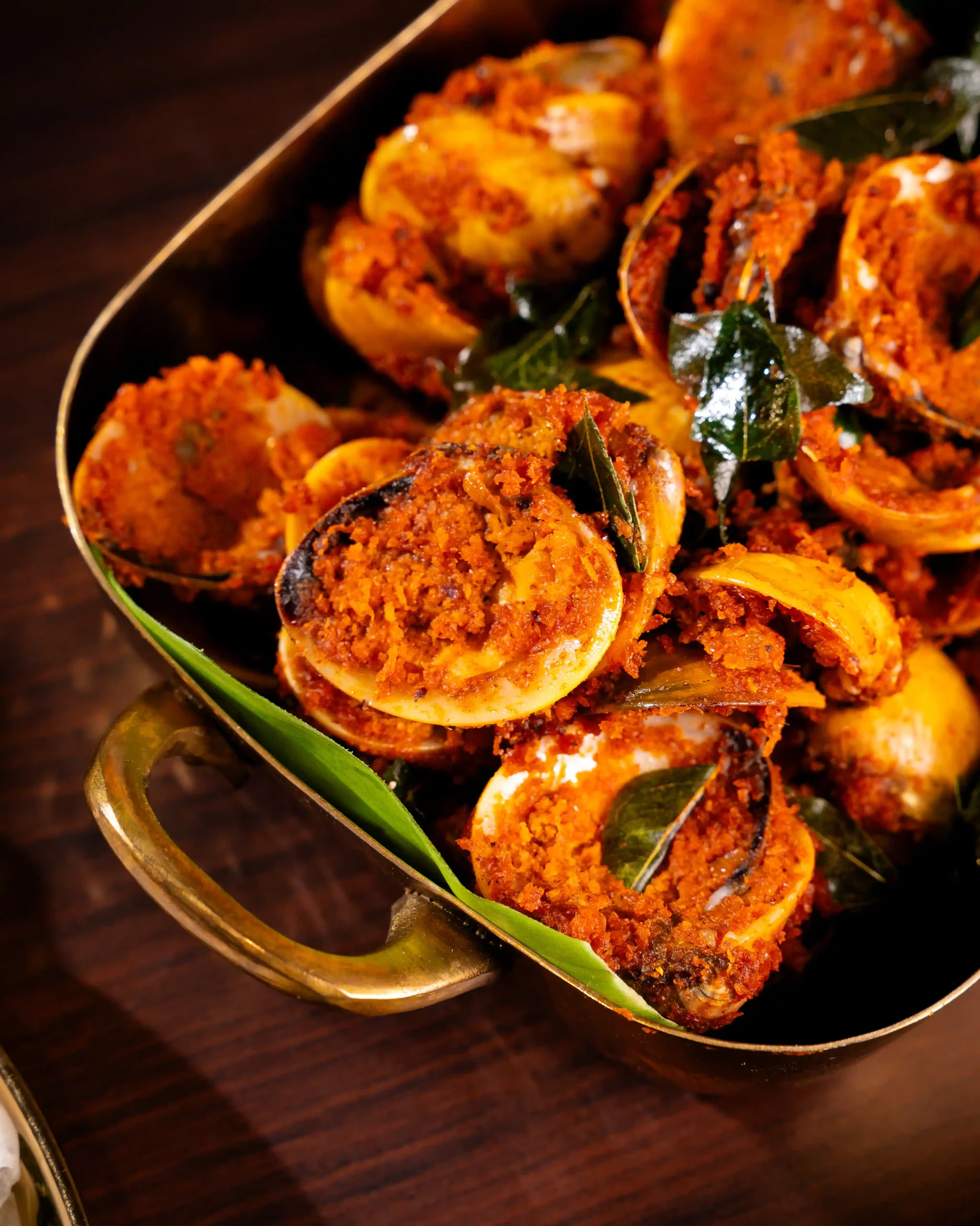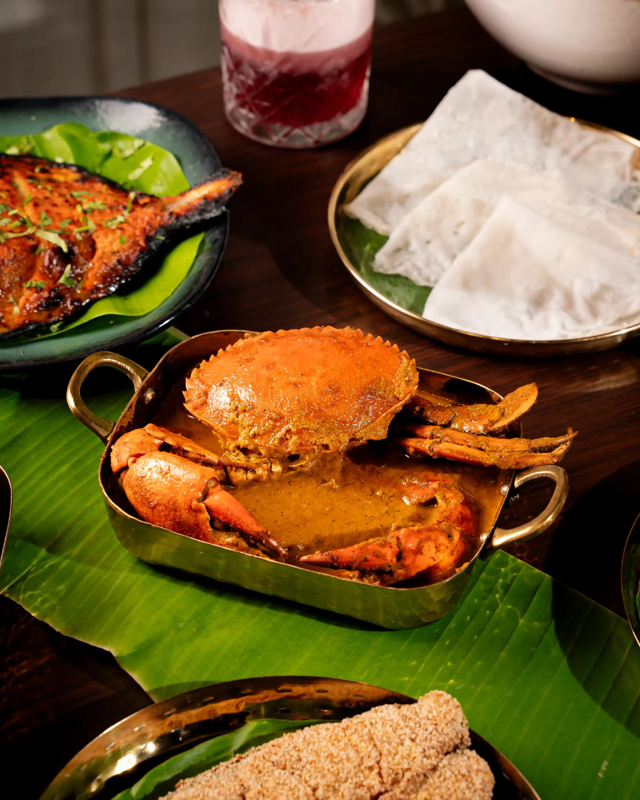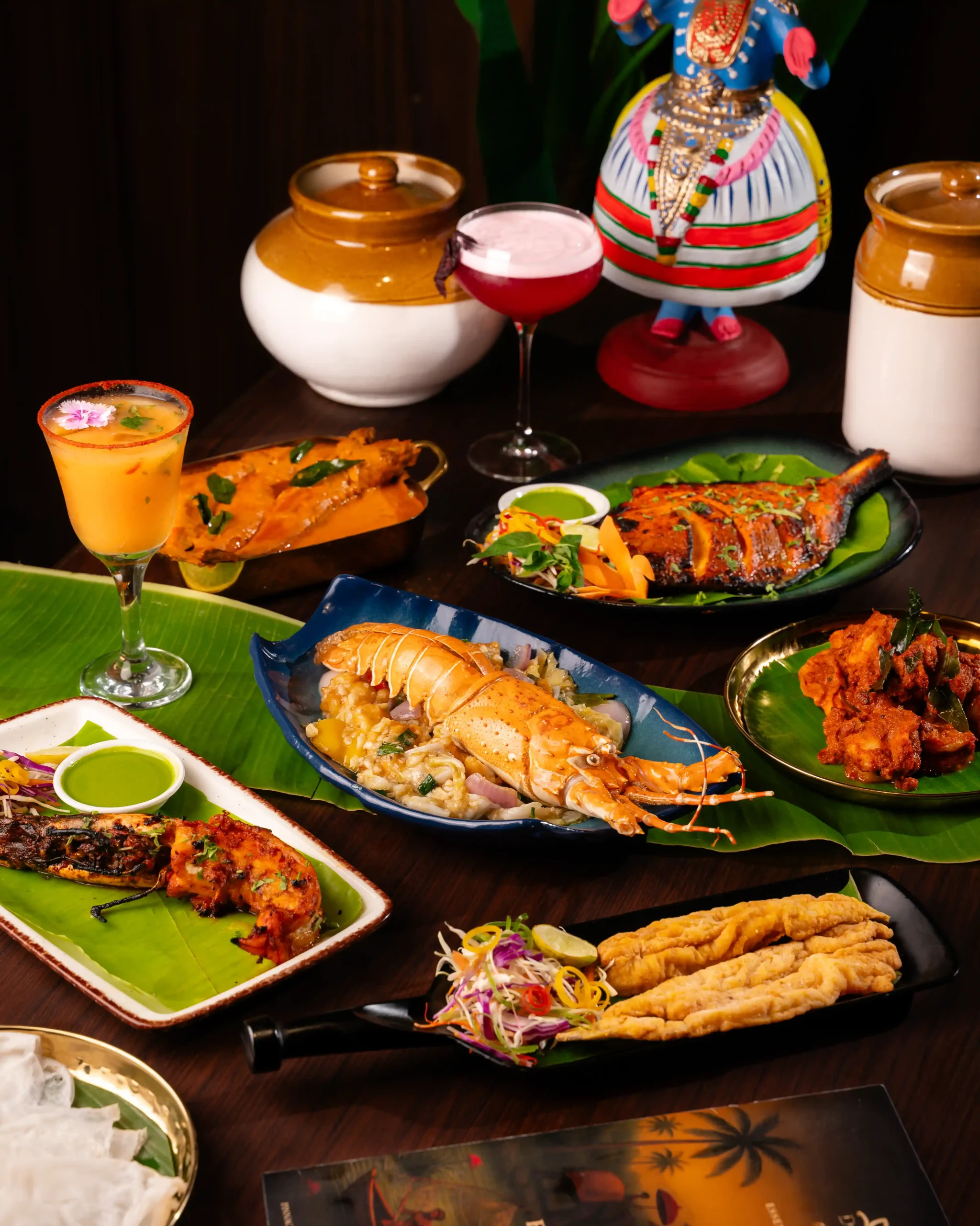The culinary programme is led by Chef Nagesh, whose approach to coastal cuisine is grounded in patience, memory, and deep respect for tradition. Each curry, masala, and seafood preparation follows ancestral techniques, allowing flavours to develop naturally and authentically. The menu features a carefully curated selection of signature dishes that showcase the diversity of coastal cooking, including the fiery Crab Chettinad, the aromatic Pomfret Gassi with freshly ground coconut masala, the bold Prawns Ghee Roast, the spice-forward Surmai Masala Fry, and the intensely flavourful Clams Sukka, where roasted spices and fresh coconut come together in perfect balance.