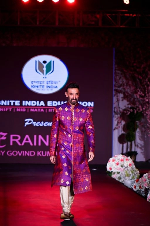 Rainush by Mr. Govind Kumar Singh, celebrated the happy go bride with a colour palette of pastels and red’s. The garments were embroidered and embellished with white stones and focused on the detailing of the garment. The collection presented the showstopper dress by the famous actor Mr. Rahul Dev. He was seen wearing the brocade sherwani.