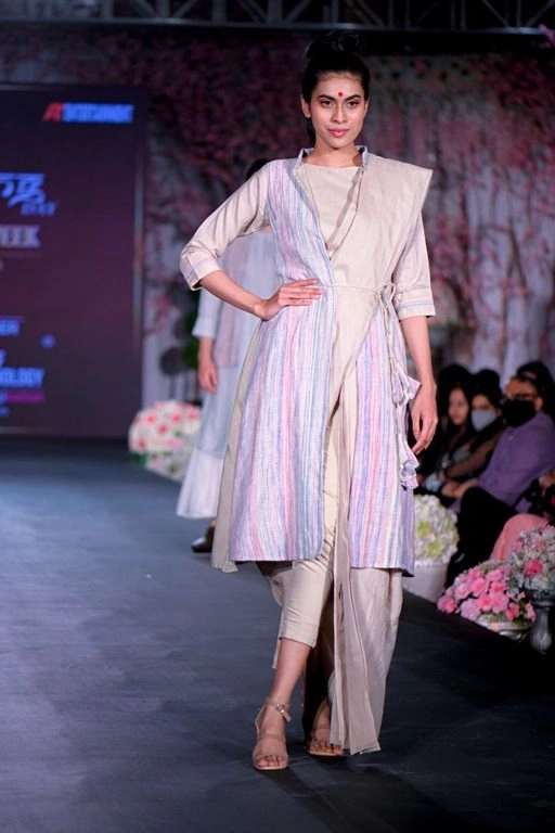 JD Institute of Fashion Technology, who was also the Educational Partner for the Fall Fashion Week, showcased their alumni students Ms. Annapurna Goswami, Ms. Bhavana Kamisetti and Mr. Jagadish K. The collection Flower child was presented by Ms. Annapurna, a resort wear line of pre- draped sarees incorporating Macramé’ and Crochet work, inspired from Rococo art. The colour palette included a combination of pastels and bright colours.