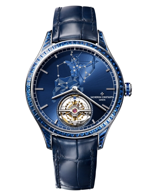 2. Vacheron Constantin: It combines heritage with artistry. For her, the Overseas Quartz dazzles with a 33 mm case, 78 brilliant-cut diamonds, and three interchangeable straps in pink gold, leather, and rubber, merging femininity with versatility. For him, the Métiers d’Art Tribute to the Celestial features zodiac constellations in hand-guilloché designs, diamond ‘stars’, and 39 mm white gold cases set with baguette-cut sapphires. Powered by an ultra-thin tourbillon movement, these pieces highlight technical mastery and celestial elegance for festive celebrations.