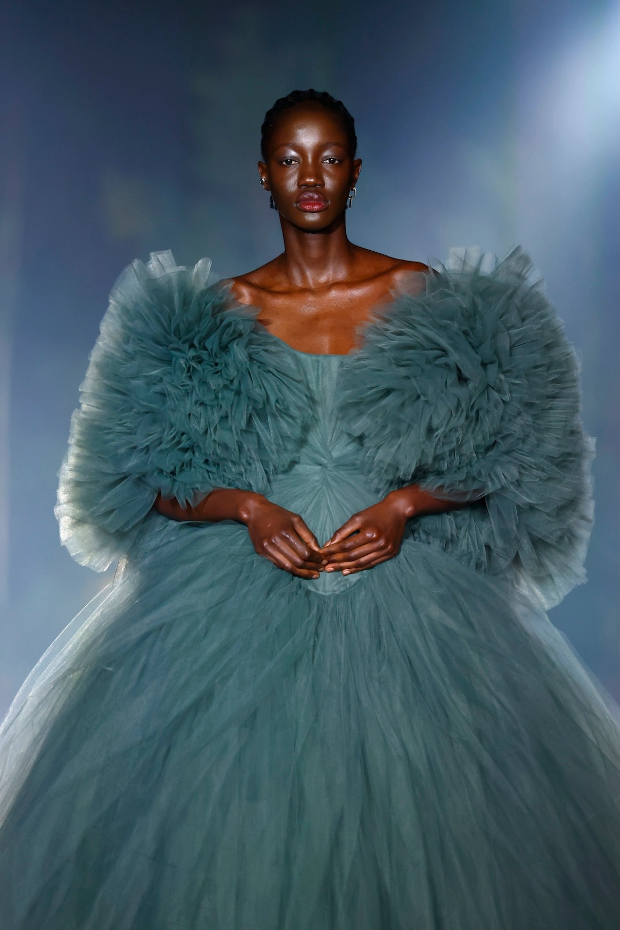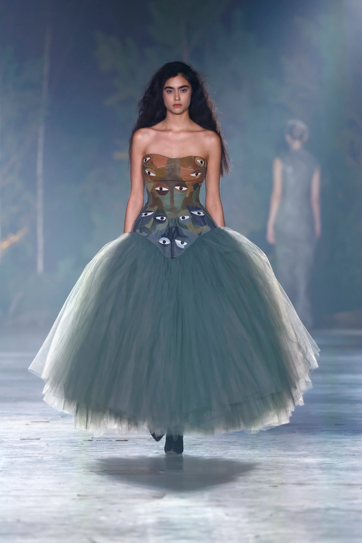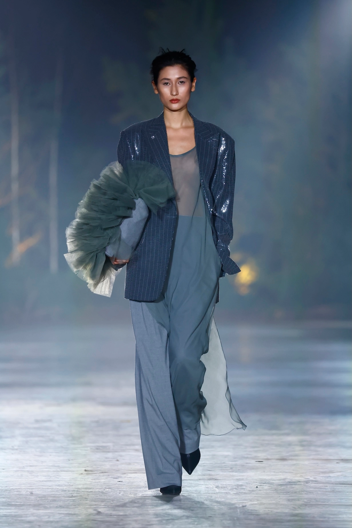 Materiality is at the heart of the design. A conscious mix of tulle, transparent fabrics, and recycled and deadstock textiles creates garments with unique surface textures.