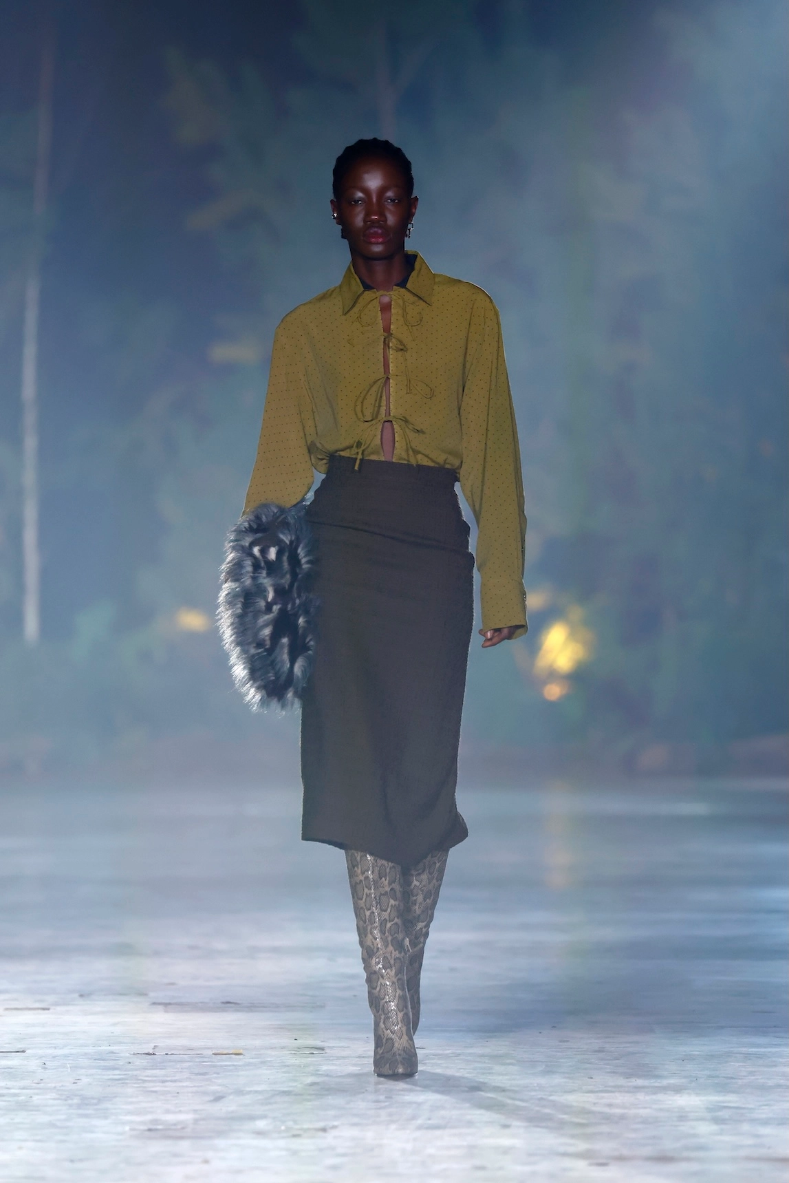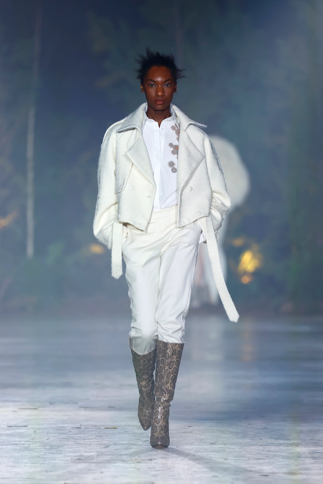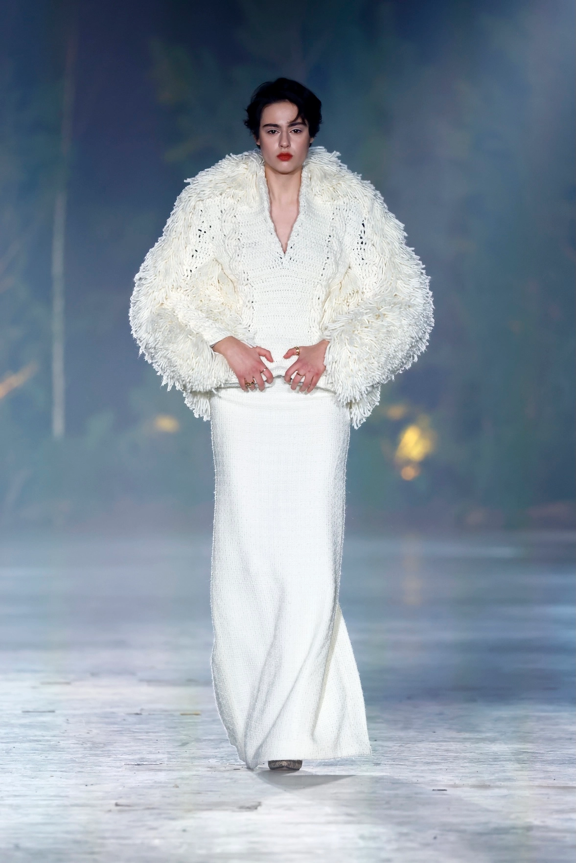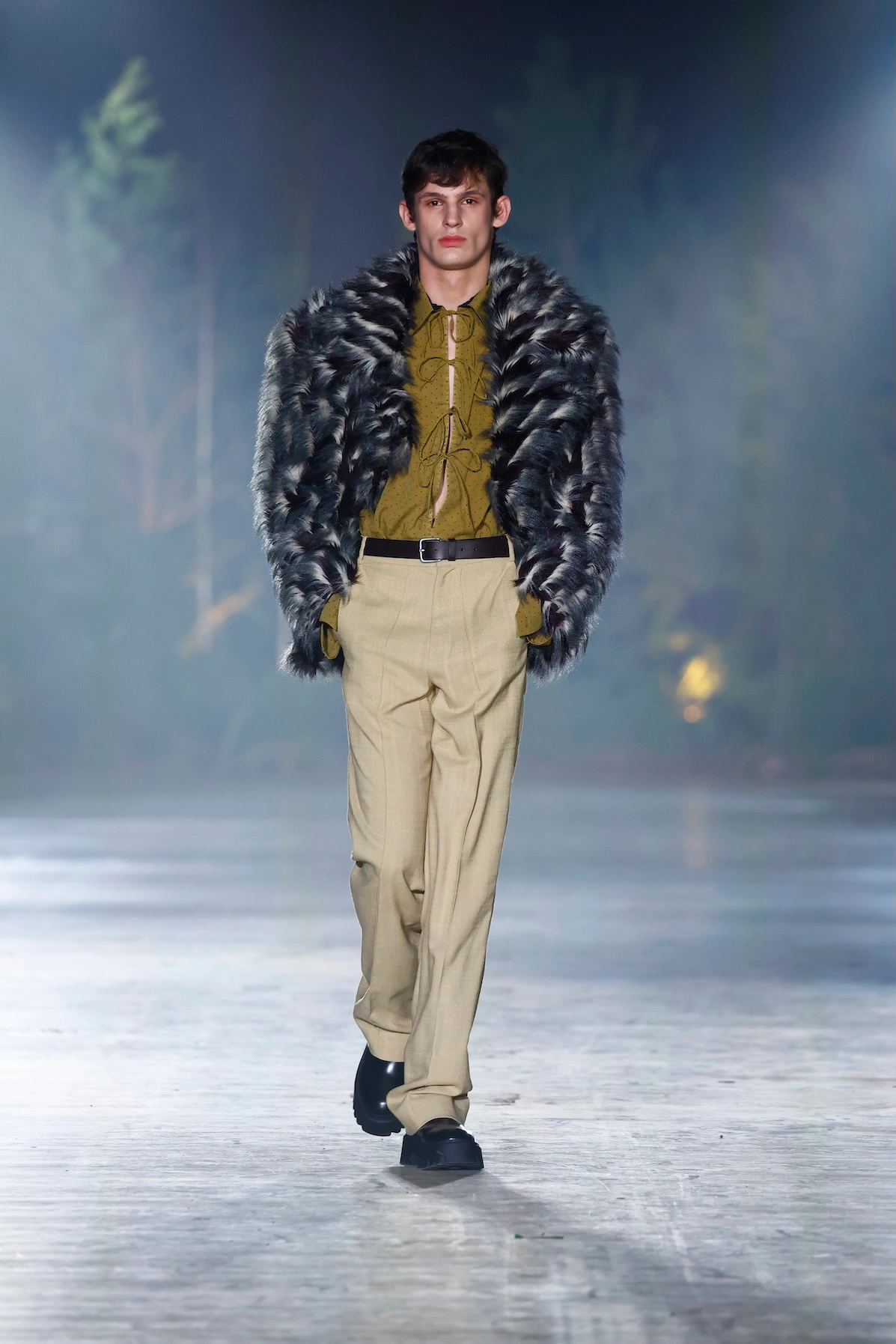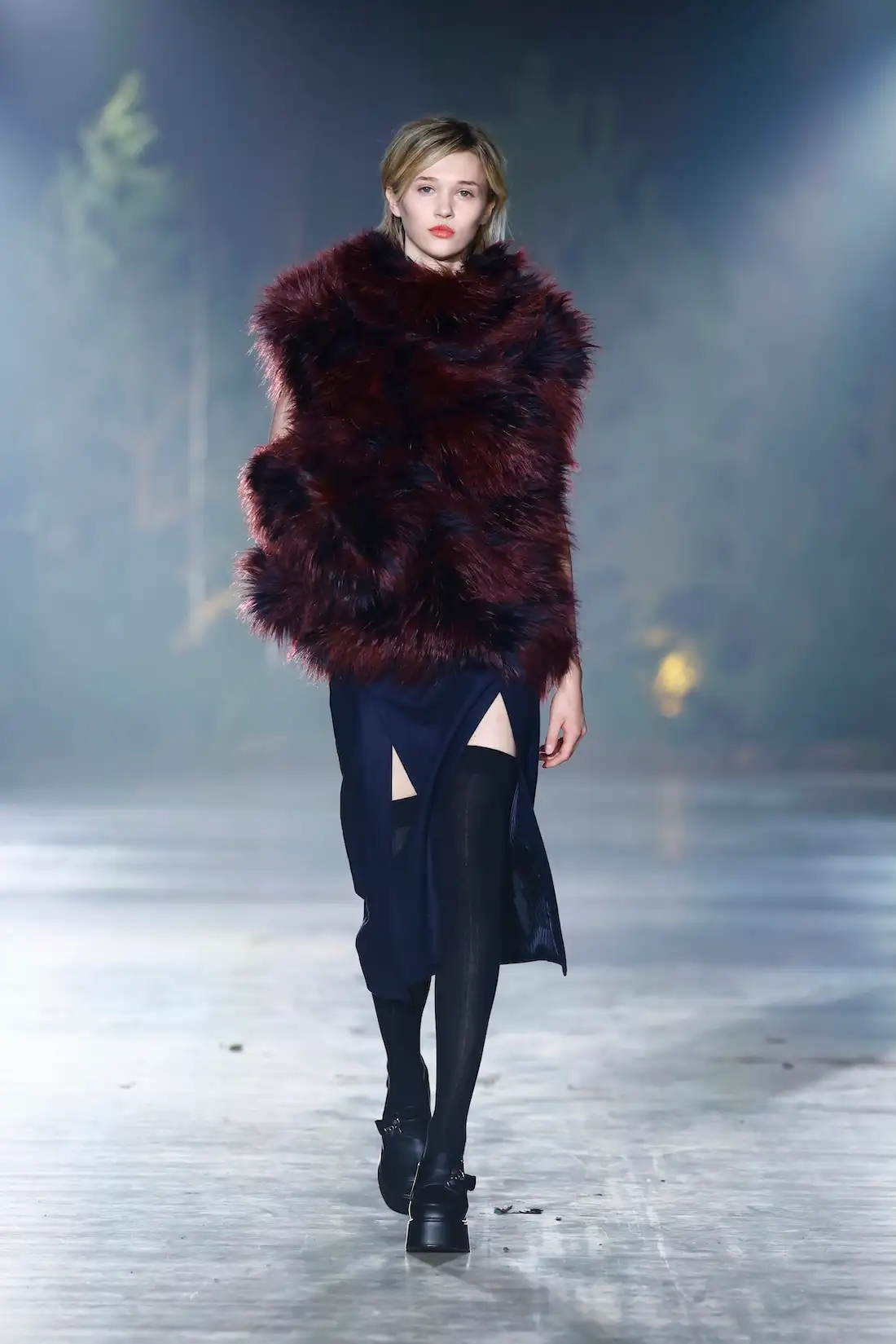 Nature is omnipresent. With Numinous, Danny Reinke presented a collection at Berlin Fashion Week that understands the forest not as a mere backdrop, but as an independent force. The staging condensed the space into an intense, almost ritualistic atmosphere, supported by live music, subdued lighting, and a clear narrative dramaturgy. The collection moves between prêt-à-couture and sculptural designs, whose silhouettes convey both security and fragility. Volume meets precise cuts, long lines meet fragmented forms. Coats, dresses, and ensembles made of faux fur and virgin wool play a central role. Almost alive, they appear like animalistic beings emerging from the darkness and attentively observing the space.