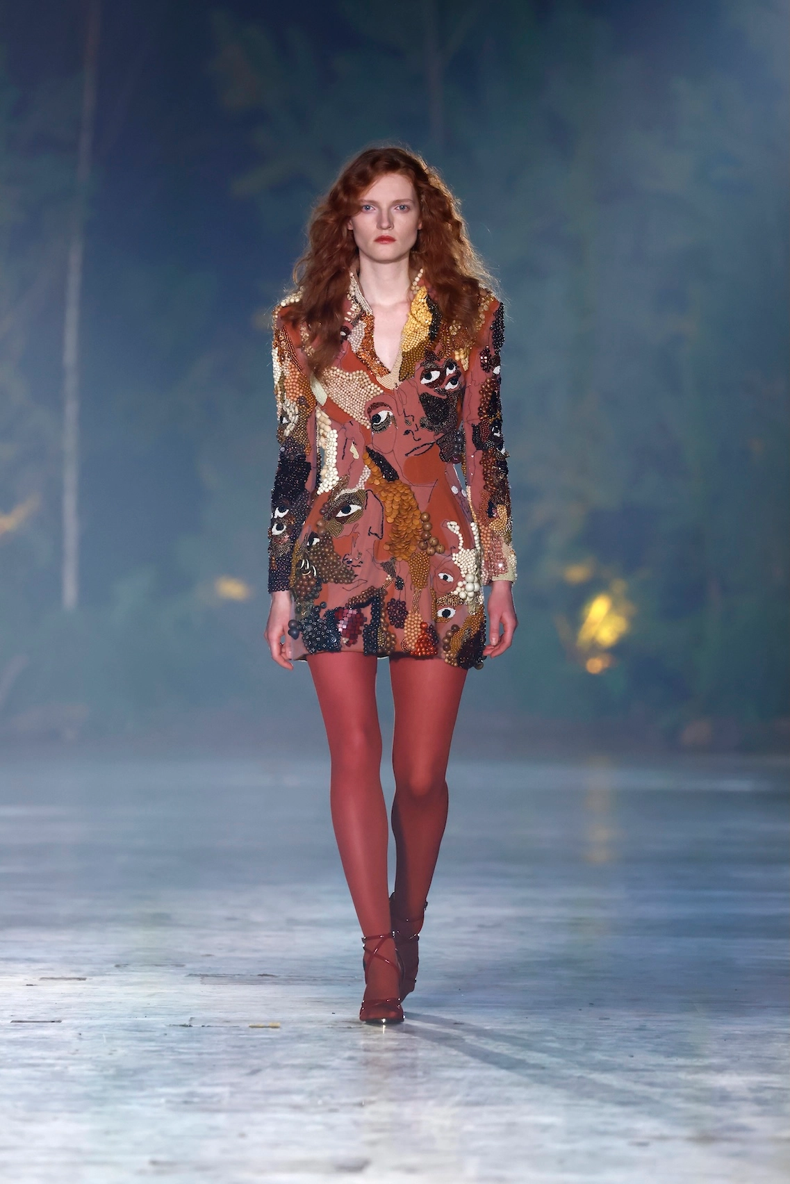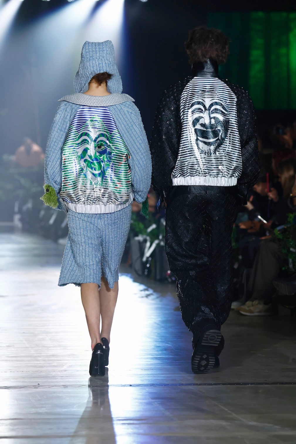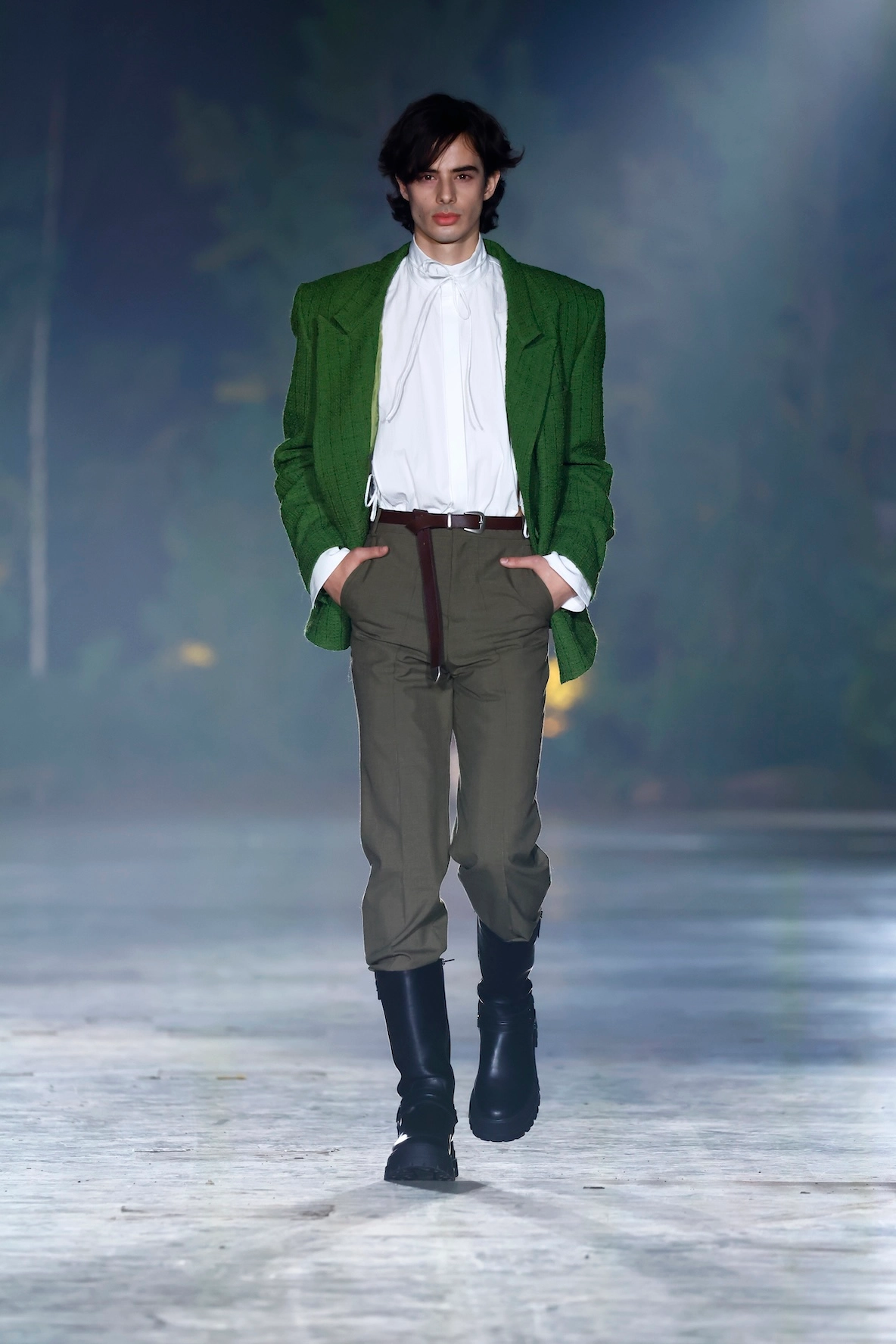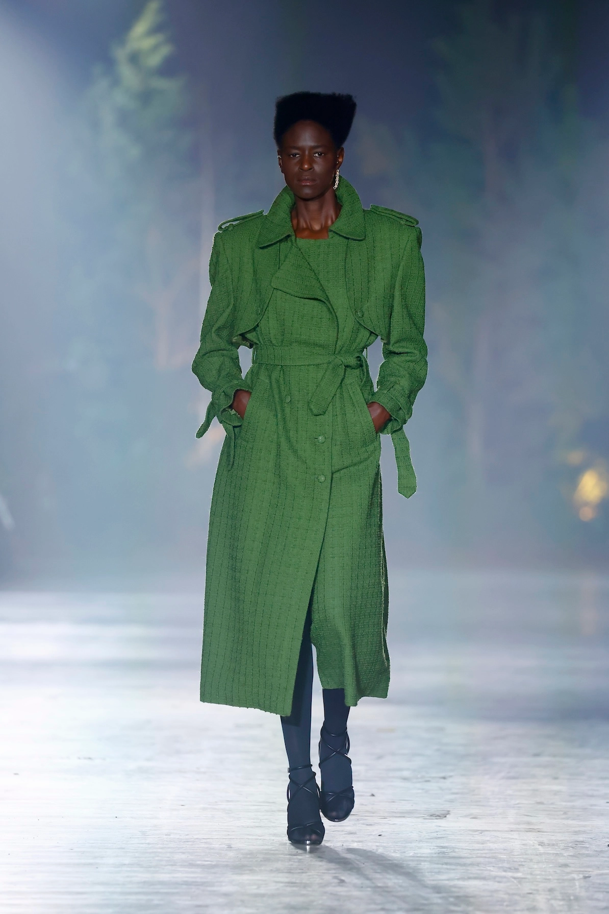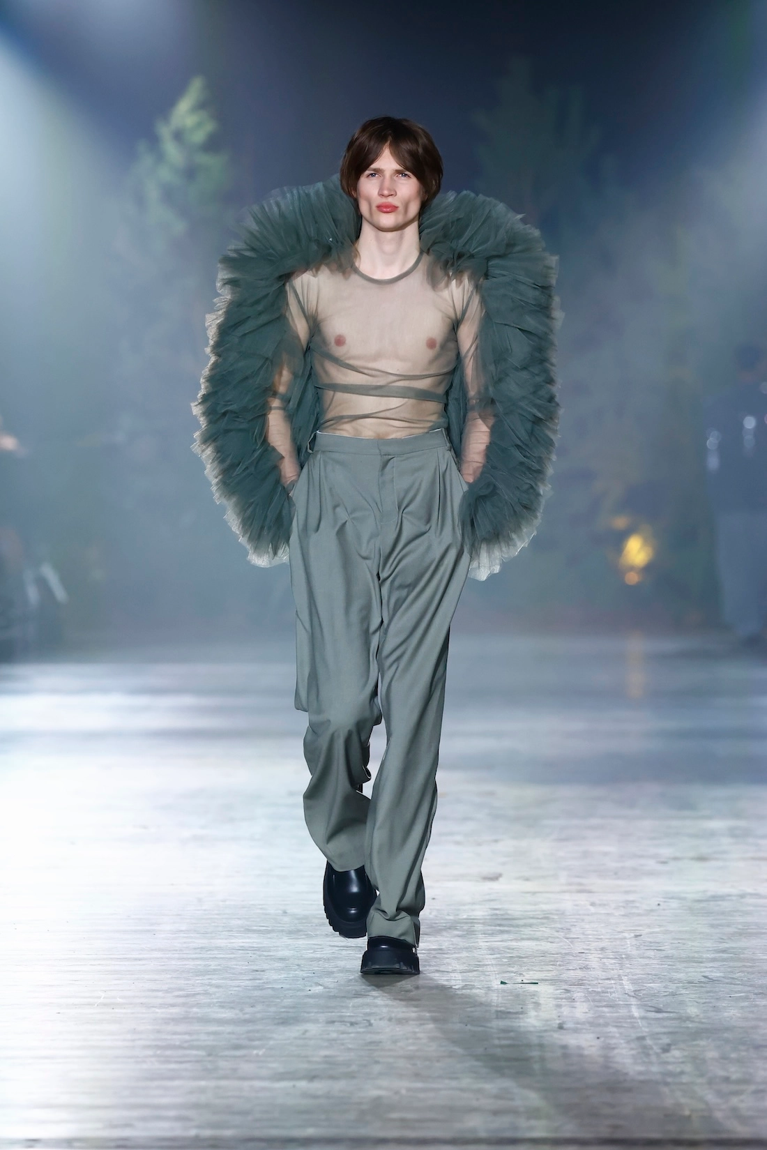 Nature is omnipresent. With Numinous, Danny Reinke presented a collection at Berlin Fashion Week that understands the forest not as a mere backdrop, but as an independent force. The staging condensed the space into an intense, almost ritualistic atmosphere, supported by live music, subdued lighting, and a clear narrative dramaturgy. The collection moves between prêt-à-couture and sculptural designs, whose silhouettes convey both security and fragility. Volume meets precise cuts, long lines meet fragmented forms. Coats, dresses, and ensembles made of faux fur and virgin wool play a central role. Almost alive, they appear like animalistic beings emerging from the darkness and attentively observing the space.