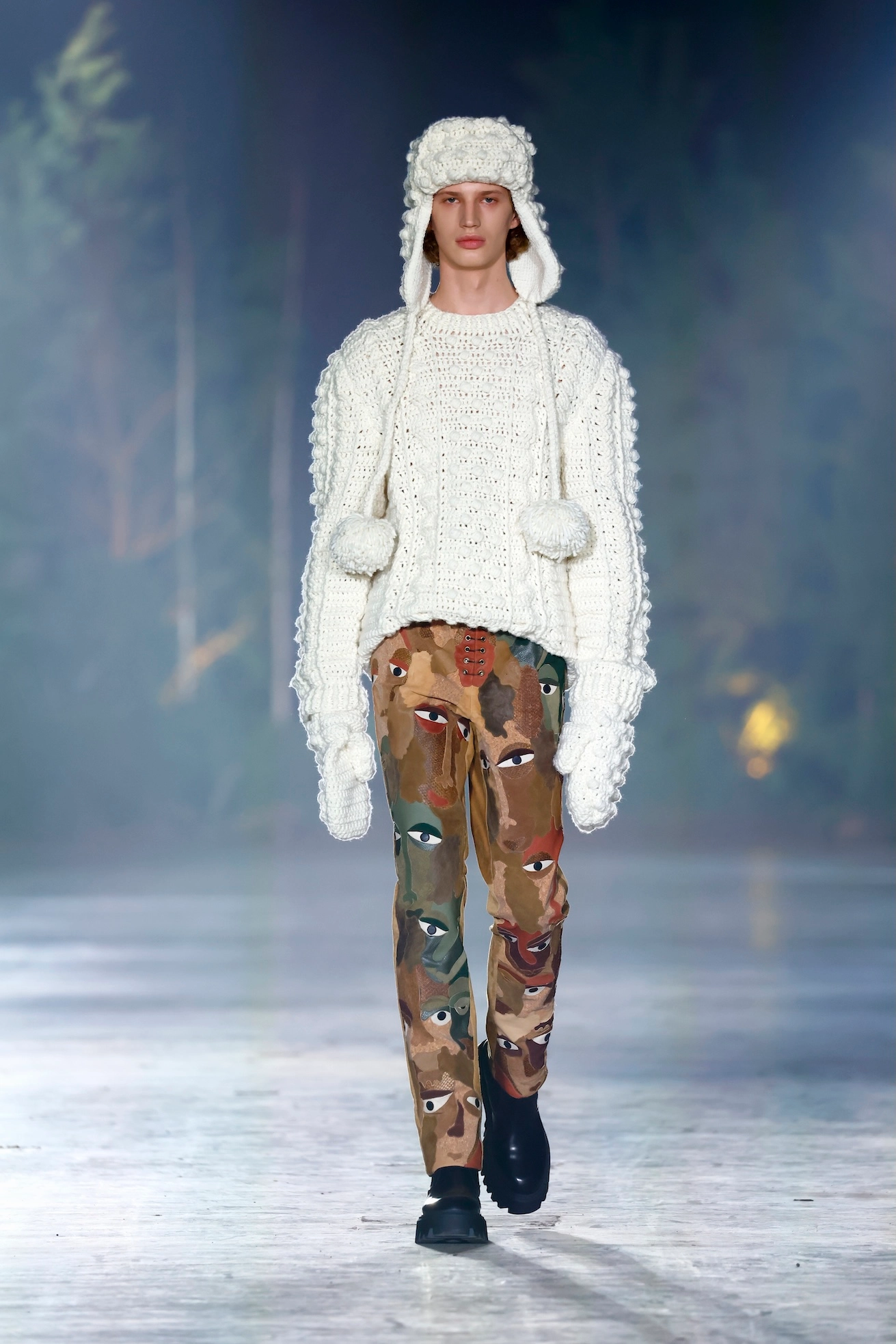 Parts of the collection appear deliberately incomplete – organically grown, like snapshots of an ongoing process. Large-volume tulle silhouettes and expansive ruffles seem to be in constant motion, beyond clear contours. This interplay of form and dissolution continues in surrealistically designed faces made of elaborate leather patchwork and bead applications, inspired by the expressive imagery of Edvard Munch and Ernst Ludwig Kirchner: distorted, intense, oscillating between inner tension and expressiveness. An essential component of the collection is hand-woven fabrics made from collected leftover materials. Ropes, wool, felt and leather scraps, raffia, and other natural materials of diverse origins merge into a new, unique fabric. Hand-knitted sweaters, hats, gloves, and accessories with a coarse texture add a layer of protection and warmth to the collection. Light, chiffon-like materials drape like morning mist over heavier textures, partially dissolving them and creating fleeting contrasts. This creates the image of a collection that oscillates between nature and the art world, between external reality and inner perception—mysterious, raw, and deeply emotional.
